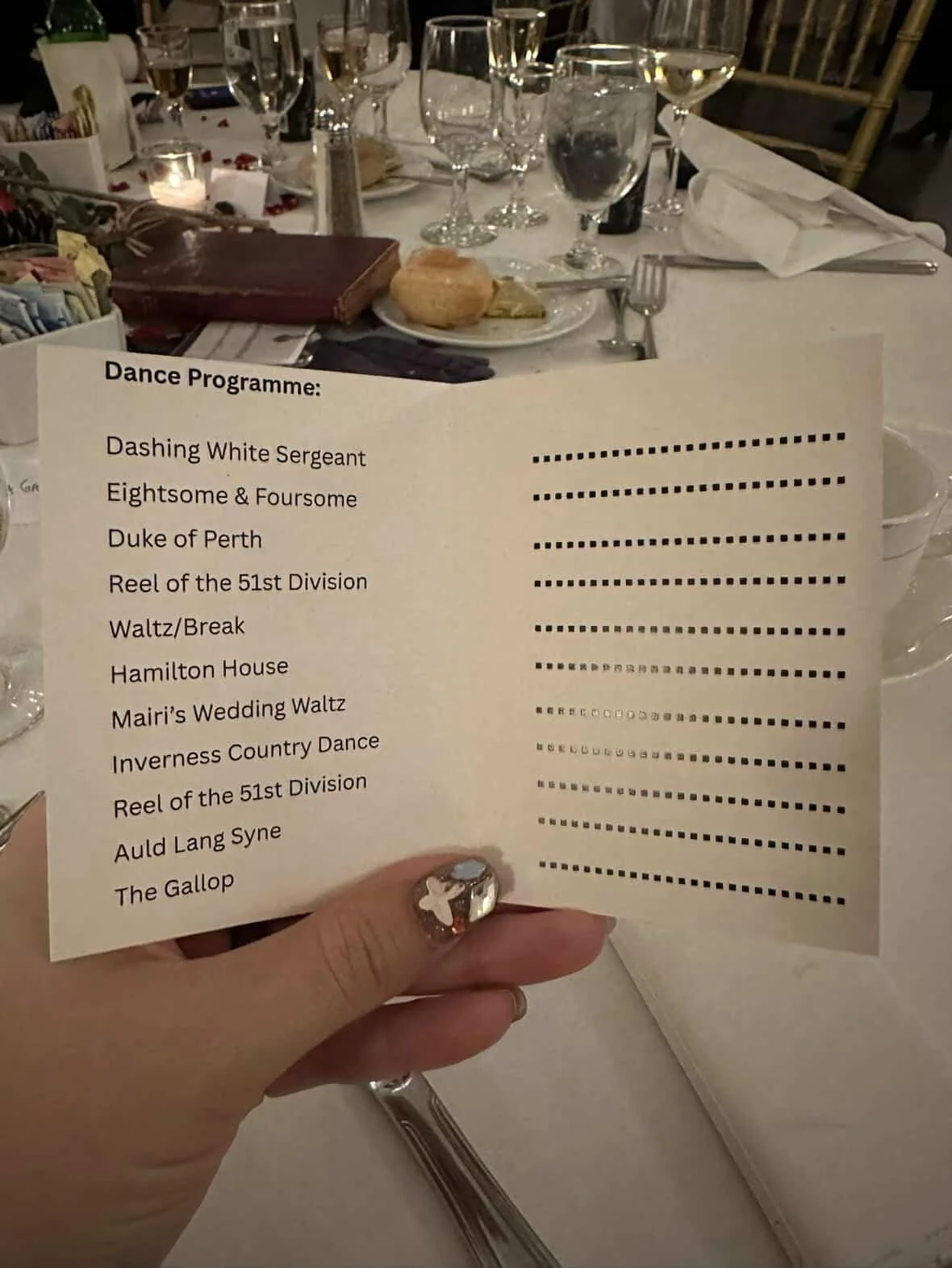They handed out dance cards. Actual dance cards—one of those historical traditions you immediately wonder why we ever let die. You write your partner’s name next to each dance listed so there’s no awkward scrambling later. Pass your card around the table, mark the dances you absolutely cannot attempt, and enjoy yourself. Three minutes of commitment. Spin. Laugh. Release.