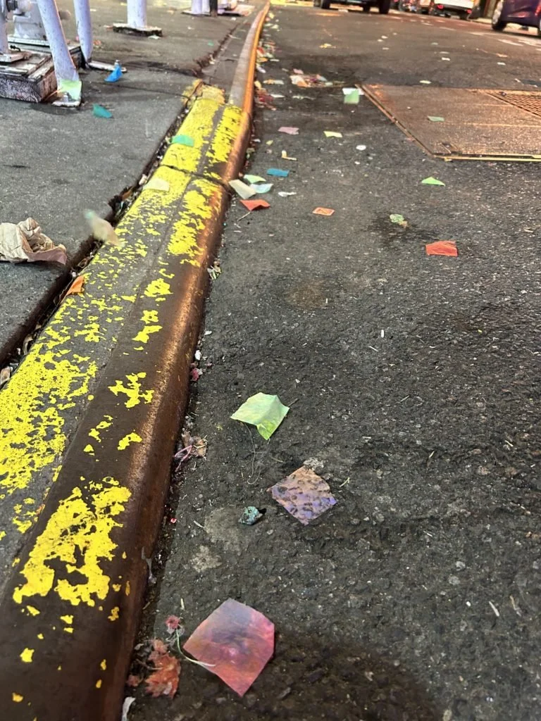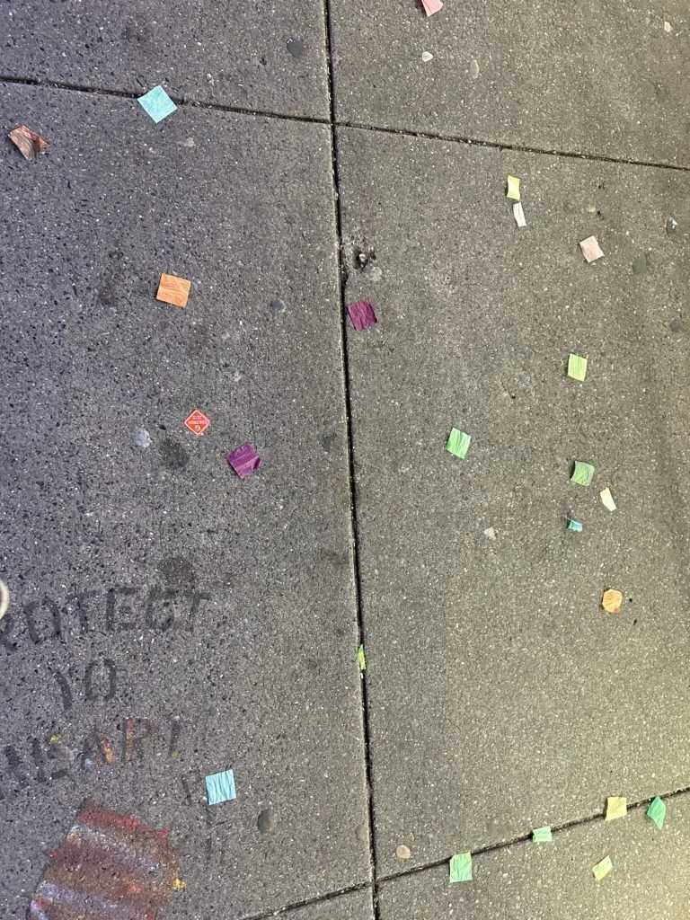 I left after they did. Walking toward the train, I passed the darkened marquis and contemplated the left-over confetti that was still blowing around the sidewalks and doorways of the theatre district two whole weeks later.