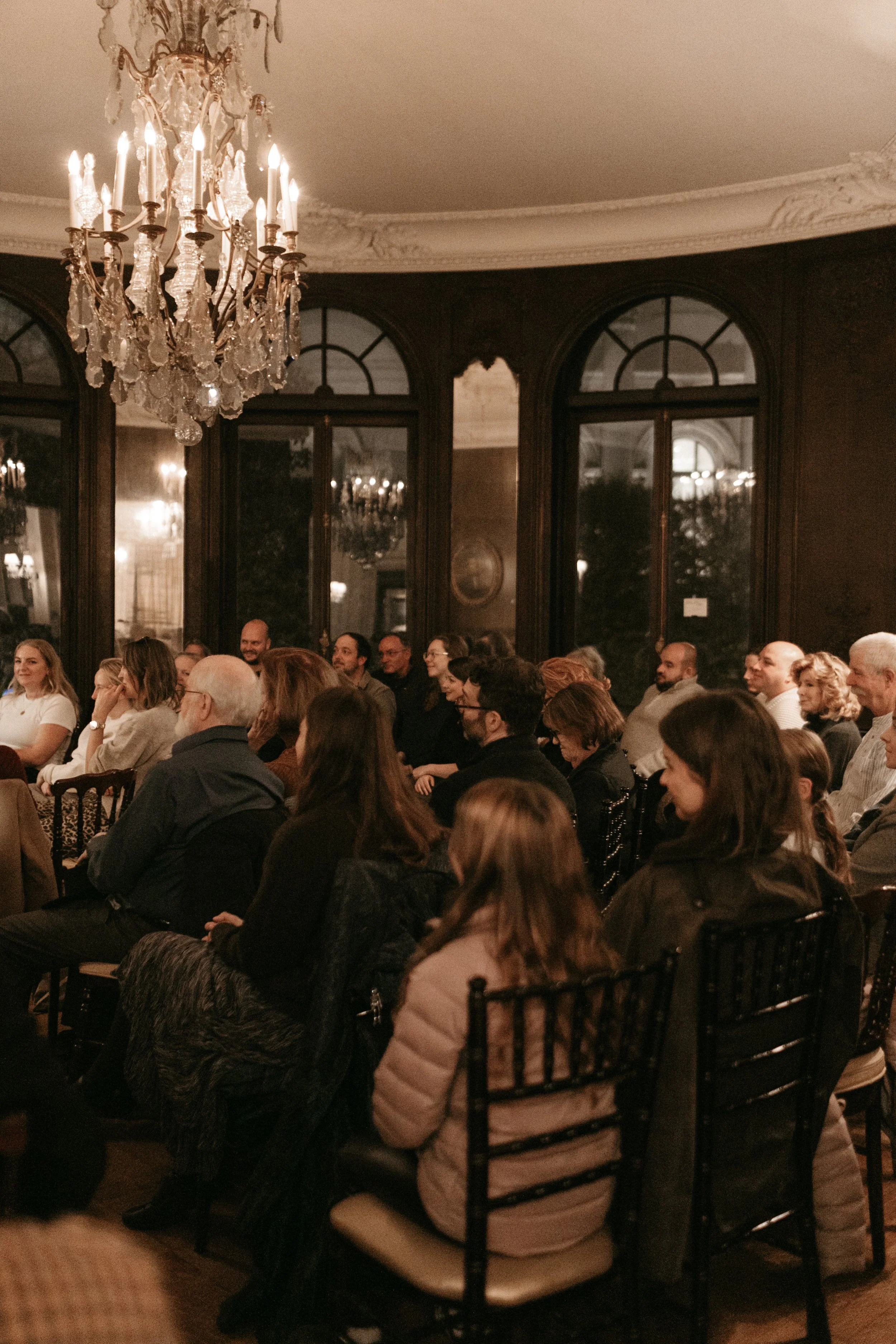 I’m sitting in one of the last Gilded Age mansions still standing in the city, gazing around the music room. Dark wood panels are carved with ornate vines. The smokey crystal chandelier glitters from the plaster-medallioned ceiling. I’m surrounded by dozens of whispering people. We are all gathered around an ornate marble fireplace, occasionally glancing up at the carved turnip atop it, candle flickering inside.
